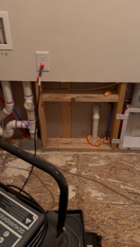 (laundry room with flooring and wall removed, and dehumidifier running 24/7-caused by a leak)